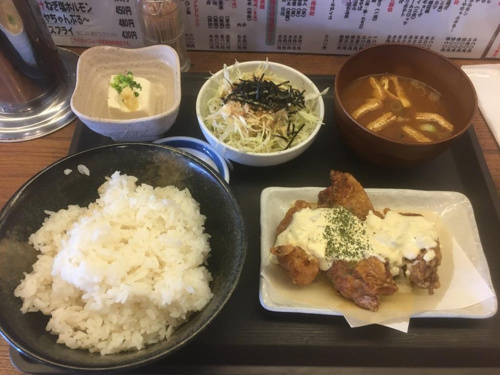 色々とメニューはあったのですが、串焼き5本セットやネギ塩ブタ丼は15分くらい時間がかかるというので、比較的すぐ提供される「チキン南蛮定食」を注文しました。