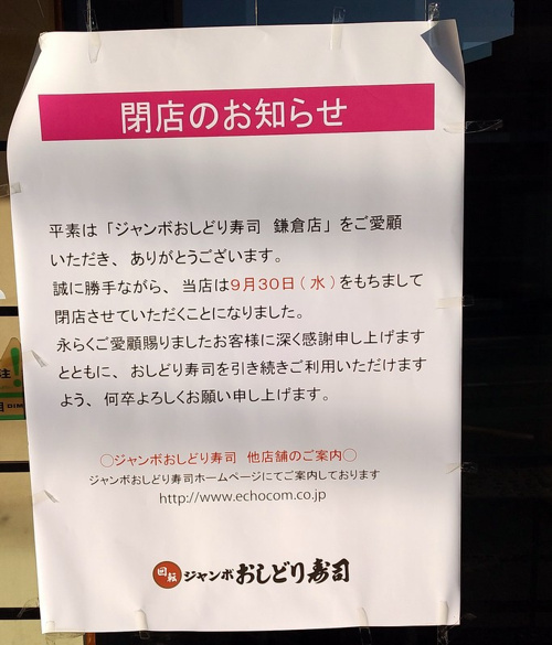 株式会社ジェイワン ホームメイトFC大船駅前店 > ホームメイトFC大船店 株式会社ジェイワンのスタッフブログ記事一覧 > 「気付かなかった!|ジャンボおしどり寿司 鎌倉店 閉店」 【ホームメイト大船駅前店 ジェイワンの賃貸ブログ】