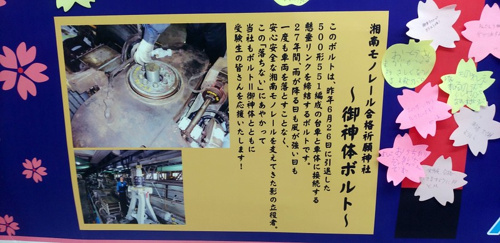 鎌倉市大船の湘南モノレール大船駅のホームに、懸垂式でも「落ちない」車両を支えてきたボルトを“ご神体”とする「合格祈願神社」がつくられ、受験生らの人気を集めている。発案者の花香晋生広報課長は「来春、この駅から学生さんたちの笑顔が広がってほしい」と願っている。きっかけは2016年の晩秋。塾から帰宅する中学生を見た花香さんが「何か応援できることはないか」と思い立ち、翌17年から、受験シーズンを前に設置するようになったという。ボルトは、モノレールの台車と車体を固定するもので、16年6月に引退した車両を27年間支えてきたうちの3本。朱色の紙でつくった鳥居に飾られている。周囲には、すでに願い事を書いた付箋がたくさん貼られており、受験生のお願いに交じって、「みんなが希望校に合格できますように じぃじ ばぁば」「コロナが早く終息しますように」といった祈願もある。