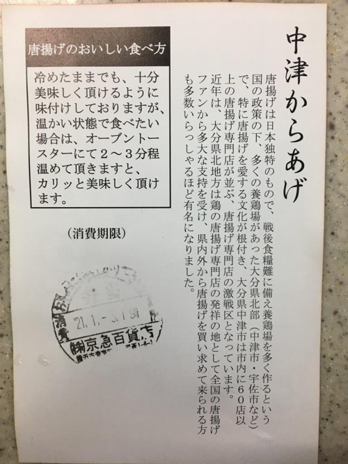 さて、本日もまた話がそれてしまいましたが、2020年のからあげブームということで正月に京急百貨店に行った際の催事で買った「中津からあげ」を紹介いたします。