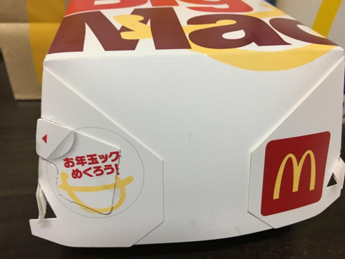 食べ終わった後、何気にビックマックの箱を捨てようとしたところ、箱の角のところに「お年玉ック めくろう!」と書いてあるものを発見!