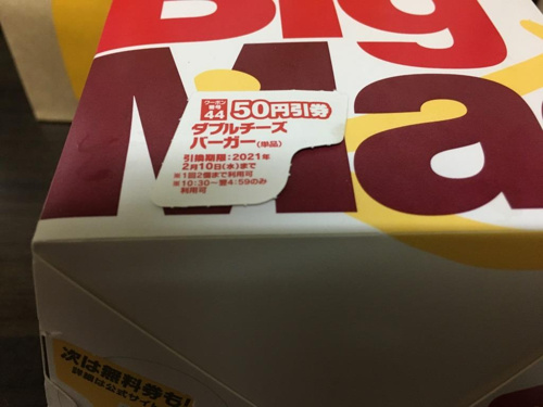 そして、めくって出てきたのはダブルチーズバーガー50円引券でした。