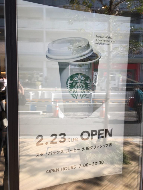 グランシップも着々と各店舗のオープン準備が進められている様子ですが、見たところスターバックスコーヒーがグランシップ大船の一番乗りのようですね。