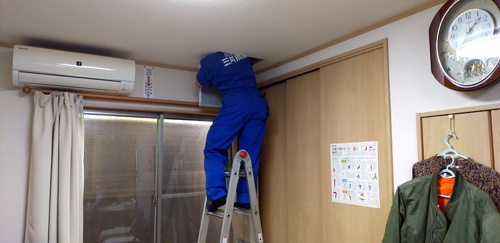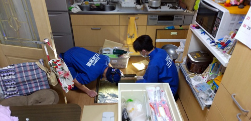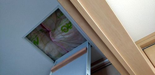 1階居間の断熱シートを外して屋根裏を見てもらってます。